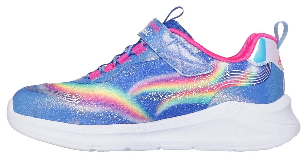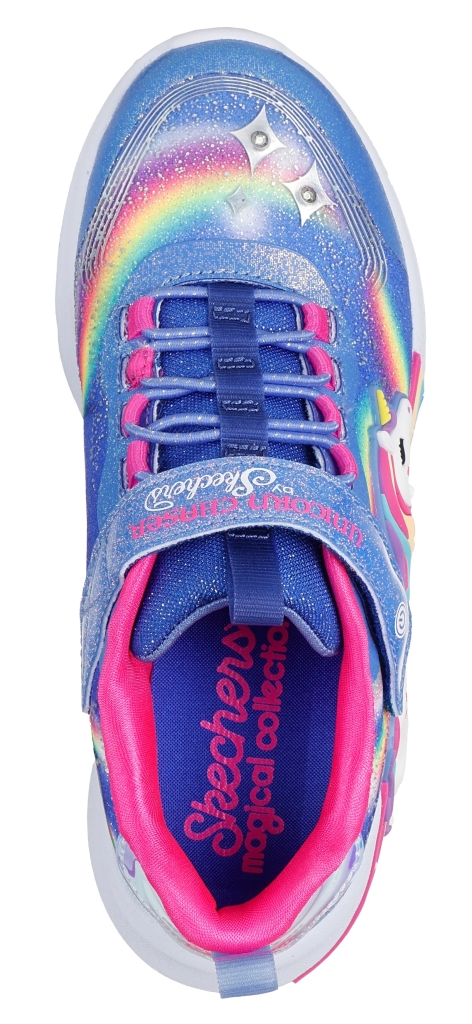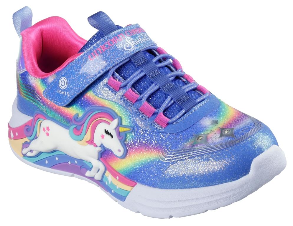Deslumbra y derrocha estilo con Skechers S-Lights Unicorn Chaser. Este modelo deportivo con luces de Magical Collection cuenta con una parte superior sintética con acabado de purpurina y un estampado de un unicornio y un arcoíris en el lateral, cordones elásticos, correa ajustable en el empeine y una cómoda plantilla con amortiguación. Con un regalo por la compra.