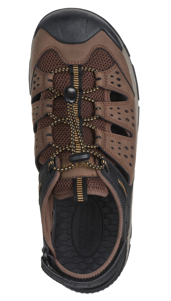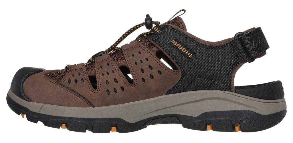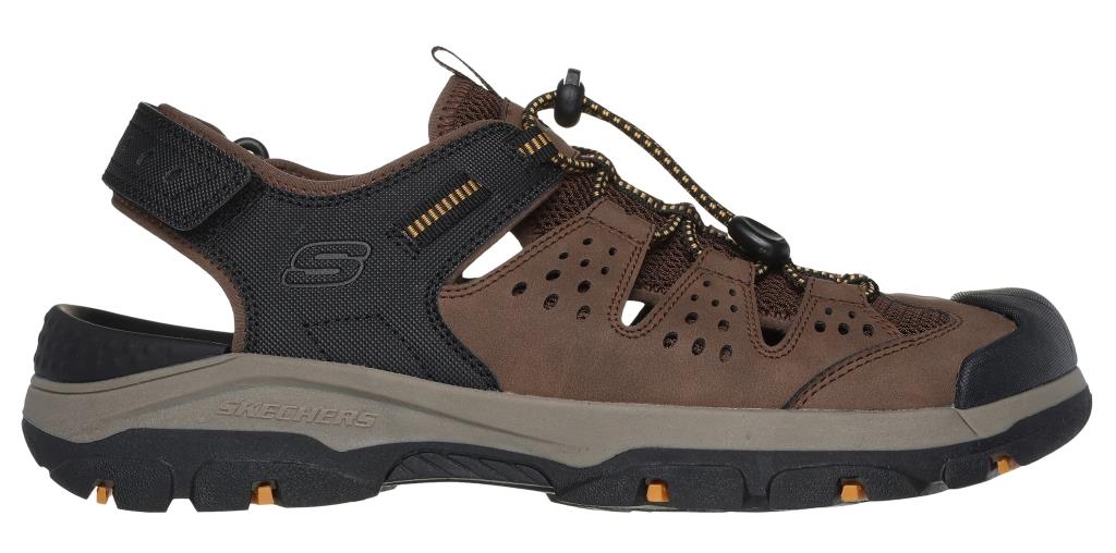 Disfruta sin complicaciones de tus aventuras gracias a la Skechers Relaxed Fit: Tresmen - Menard. Parte superior de malla y tejido sintético en una sandalia estilo pescador con puntera cerrada, sin cierre y plantilla Luxe Foam con amortiguación.