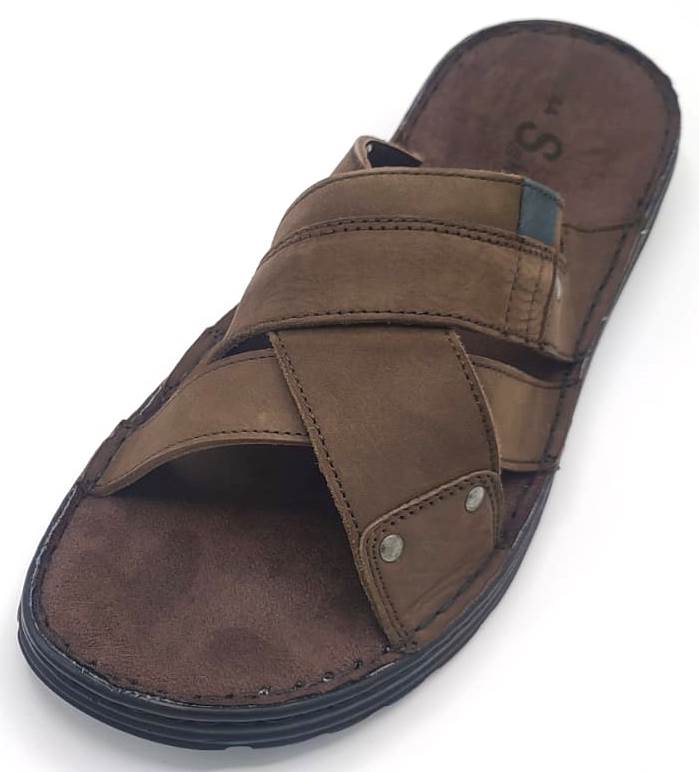 Sandalia cómoda de hombre, fabricada en piel nobuck suave. Modelo de pala cruzada, con planta acolchada de piel. Suela de goma flexible y ligera. Disponible en color marrón oscuro. Diseño clásico para el máximo confot en tus paseos de verano.