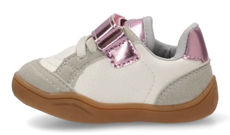 La libertad del diseño barefoot, pensado para el movimiento natural del pie, y un cierre con velcro que le permite calzárselas solita.
