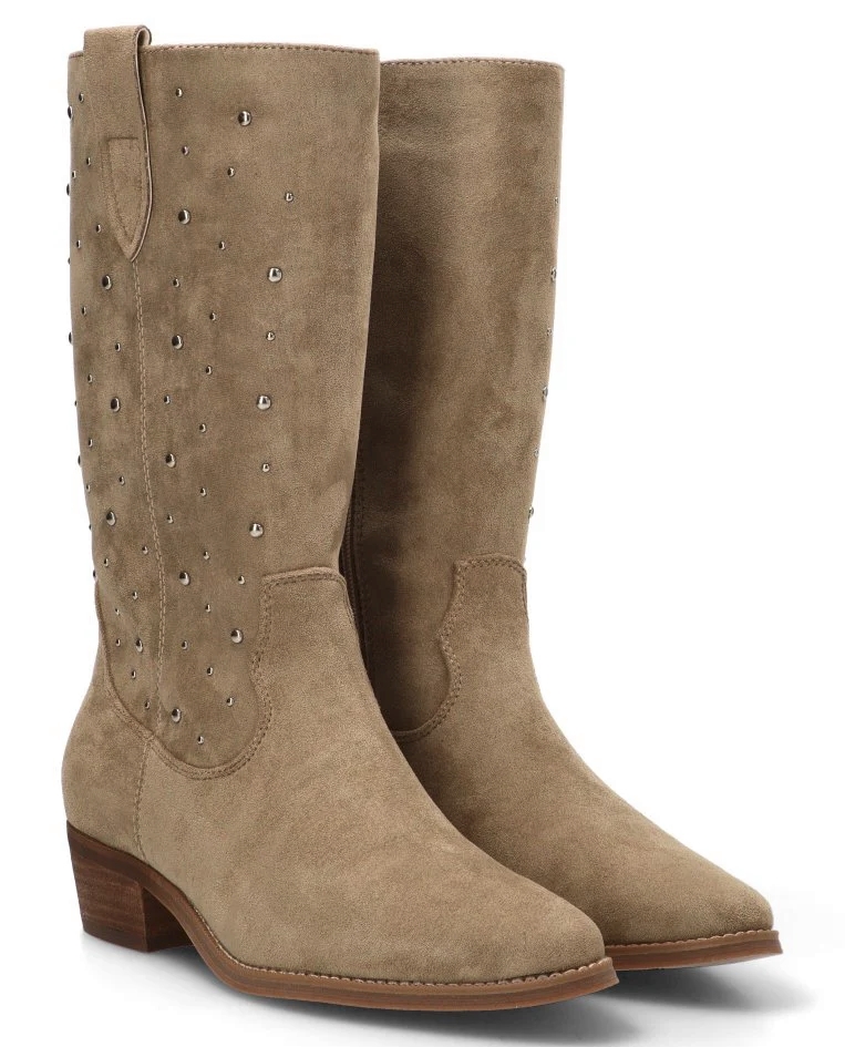 Estas botas camperas, con su distintivo y versátil color taupe, son una pieza clave para realzar tu estilo. Su diseño campero, reinterpretado de manera moderna, se adapta perfectamente a una gran variedad de estilos y ocasiones. El detalle de tachas metálicas estratégicamente colocadas le confiere un aire audaz y vanguardista.