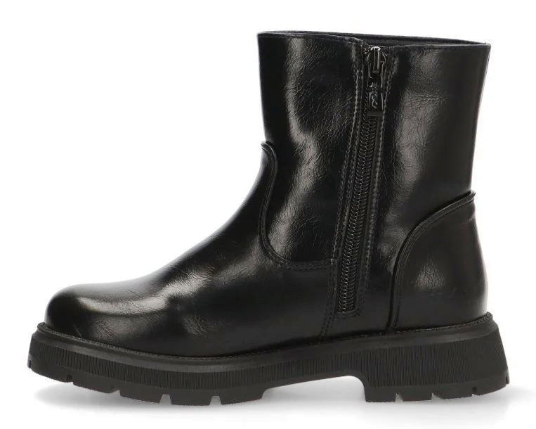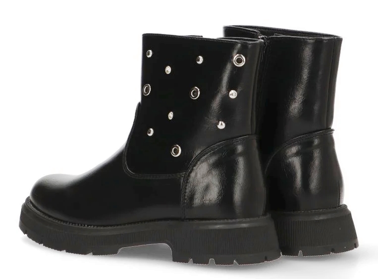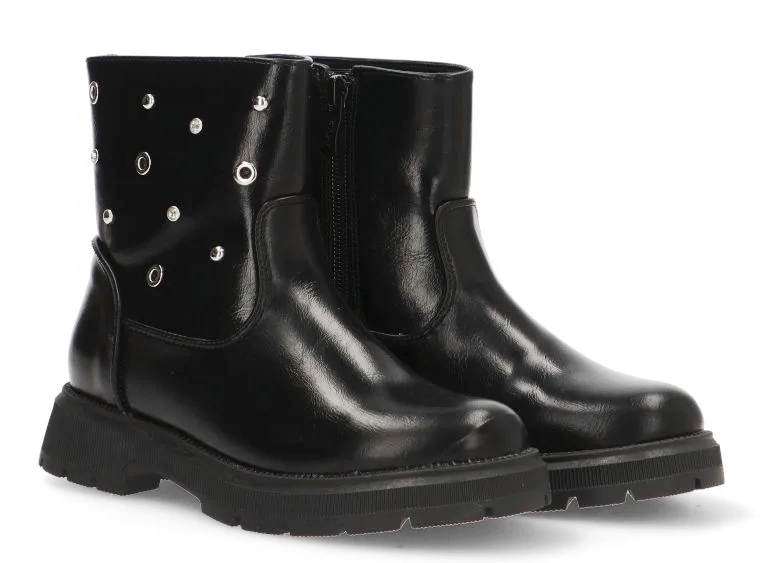 Este botín, en un clásico y versátil color negro, destaca por su imponente diseño militar con un toque de rock and roll gracias a los detalles de tachas que le dan un aire moderno y audaz. La silueta robusta, combinada con la caña de 14 cm, le da un aspecto poderoso, ideal para las exploradoras más intrépidas. La suela plana y resistente proporciona una gran tracción y estabilidad, garantizando que cada paso sea seguro.