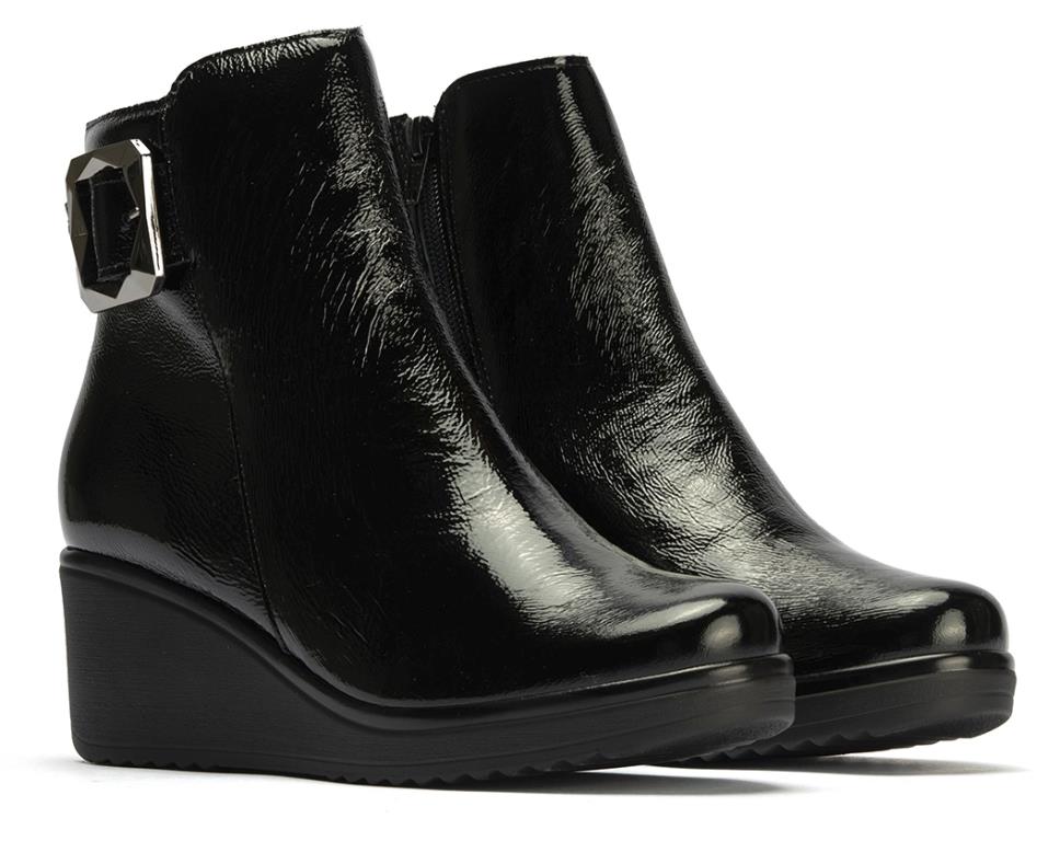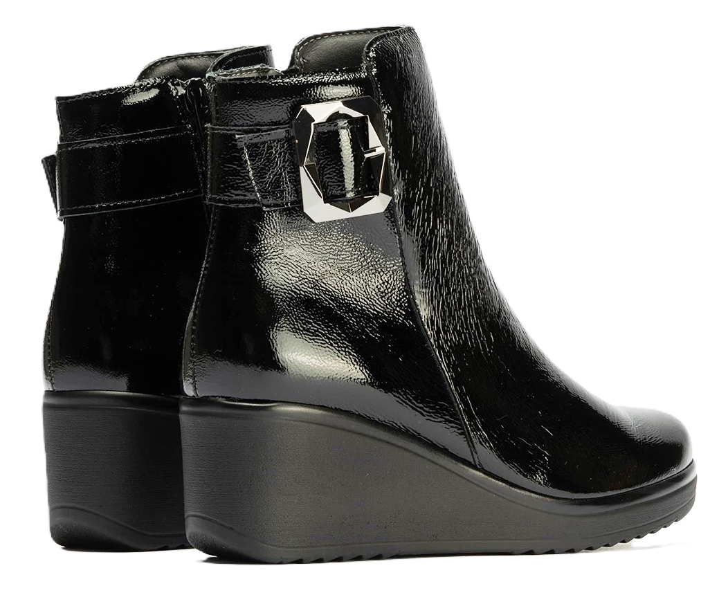 • PITILLOS 20233 Estos botines de mujer de charol negro son la definición del estilo sofisticado y funcional, ideales para la temporada de frío. La parte superior se presenta en una piel de alta calidad con un acabado barnizado brillante (charol) que aporta una sofisticación instantánea y un look resistente. El diseño de la caña es elegante y minimalista, con una llamativa hebilla metálica que actúa como adorno distintivo en la parte exterior del tobillo. La característica más práctica es la cremallera interna, que facilita enormemente el calzado y descalzado sin comprometer la estética. La base del calzado es una cuña alta e integrada que no sólo eleva la silueta, sino que también garantiza una gran estabilidad y mayor comodidad para un uso prolongado. Esta construcción de la suela ofrece un soporte excelente para el día a día. Perfectos para la mujer urbana, estos botines de cuña son la combinación ideal de estilo y funcionalidad.