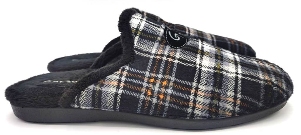 Zapatilla de casa abierta por atrás, confeccionada en material textil aterciopelado muy suave y calentito con estampado de cuadros.