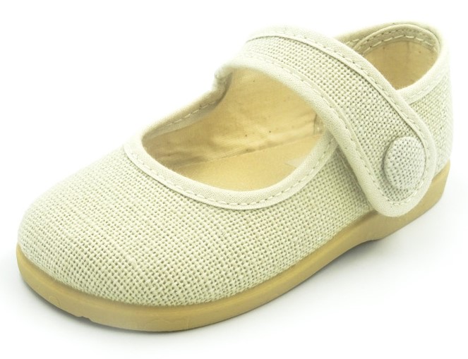 Mercedita de niña con tejido de lino, lleva un cierre con una cinta de textil adhesiva.