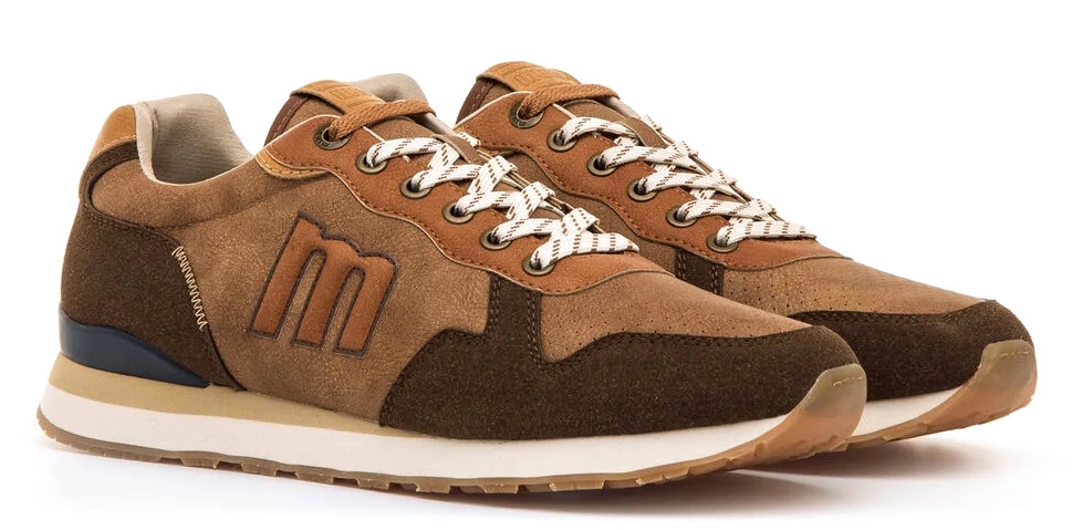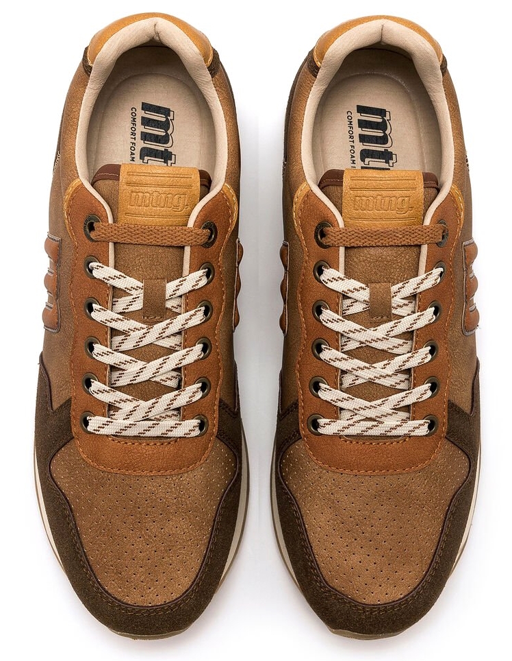 Zapatillas marrones para hombre, modelo Porland de la marca Mustang, con estilo urbano y toque retro. Diseñadas con mezcla de paneles en distintos tonos tierra, estas zapatillas ofrecen un look versátil para combinar con outfits casuales. El logotipo lateral, los cordones bicolor y la suela dentada con detalle en contraste refuerzan su diseño dinámico. La estructura ligera y sus plantillas con tecnología Starfit, mejoran la comodidad en cada paso, manteniendo un equilibrio entre funcionalidad y estética deportiva. Con certificado VEGANO sellado por INESCOP, el cual garantiza que la naturaleza química principal del material no se corresponde con fibras de origen animal.